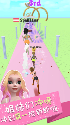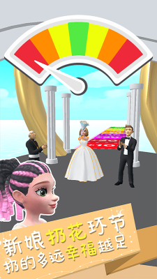 游戏画风整体来说还是比较魔性的,而这个游戏当中的主角就是新娘和她的伴娘团们,所以你们必须要在这个过程当中搜集各种各样有趣的道具去抢新郎,做一个好看的发型,这一次也能够艳压群芳,新娘在扔捧花的环节的时候扔的越远,那么她就会越幸福。