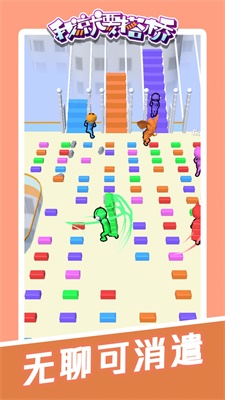 玩法简单而且操作起来特别容易上瘾的休闲竞技类的小游戏,在这个游戏当中你将控制着不同的角色,去收集更多的木板,来搭建自己前进的道路,其实这样的操作还是很考验玩家的灵活反应能力的,也很考验玩家的逻辑思维能力。