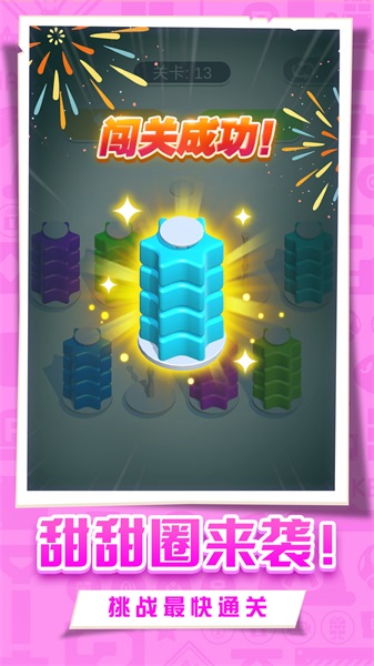 套圈大师是一款超级简单的休闲娱乐游戏,在游戏中你可以看到很多颜色的套圈,要将相同颜色的套圈组合到一个木棍上面,全部完成之后就可以挑战成功,每一个木棍上面会有五颜六色的套圈,所有的都可以去移动,在这里你可以探索色彩的奥妙,完全可以治愈大家的强迫症。