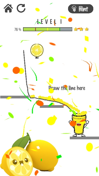 柠檬水是一款十分实惠并且好喝的饮品,深受很多人的喜欢,在这款快乐柠檬水游戏当中,我们将要动用我们的智慧和逻辑思维能力,通过画线的方式,将柠檬水倒入杯中,让我们的主人公成功喝到柠檬水,游戏的画风充满了卡通的风格,适合所有年龄段的人畅玩。
