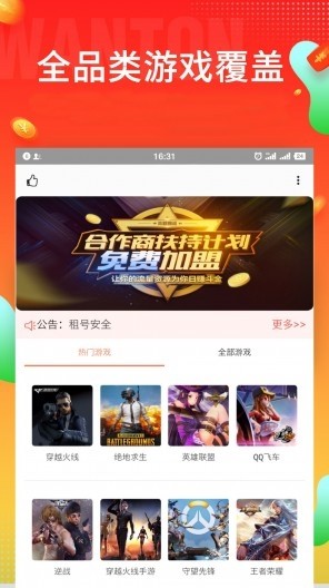 916租号专注于游戏账号租凭的手机app,这款app可以租凭包含端游,手游在内的各种游戏账号,包含游戏种类齐全,王者荣耀,和平精英,守望先锋,LOL等众多热门游戏都可以在这里进行租号服务,高段位账号,全英雄全皮肤账号也可以进行租凭,账号安全放心,价格公道优惠!