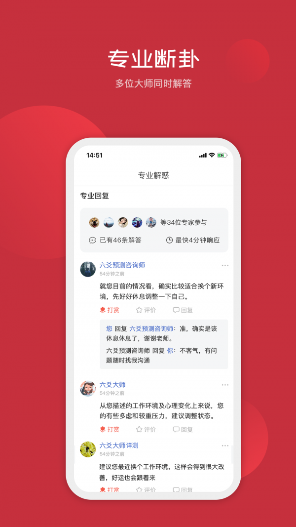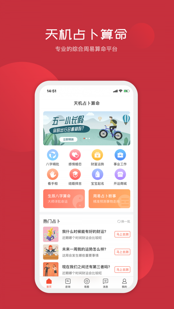 天机占卜算命为用户提供了优质便捷的算命占卜服务,解决你在生活或者工作中遇到的一些问题和困惑,真人24小时全天在线,能够让你随时随地的进行算命,如果你也感觉自己事业不顺或者想要求姻缘,知未来,那就快来下载试试吧。