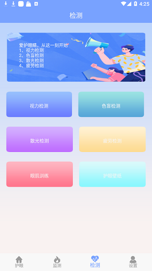 2.APP包括视力检测,色盲检测,疲劳检测和像散检测等功能。