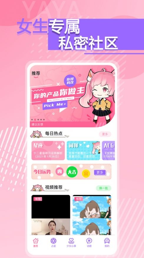 YAYA平台为广大女生们打造了一个可以尽情讨论这种话题的平台,这里面可以发布自己对于影视剧或者是热门话题的感想,也可以查询自己的星座,或者是进行美妆护肤的学习,任何话题都可以在这里进行讨论。