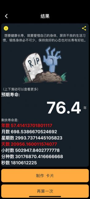 死亡计算器是一款可以帮助用户快速计算出日期的APP,能够看到自己距离死亡还有多少时间,并且可以让用户提高对于时间珍惜的观念,通过数字的形式呈现更加的直观明了,也将给用户一种紧迫感,随时拿出手机就可以使用非常的方便。