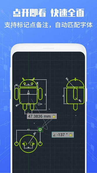 CAD手机查看器app能够让用户通过手机非常快速的看到CAD图片,并且能够在手机上完成编辑操作,非常的轻松方便,数据也是非常准确的,具有非常清晰的画面以及强大的编辑功能,更支持将自己所制作的CAD图片保存下来。