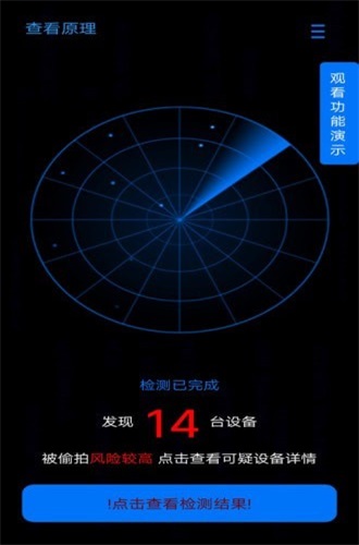 内存小,功能强大,解决被偷拍的实际问题,科技飞速发展的时代无论是什么都传播的很快,隐私变得尤为重要,一些不法分子总是在钻一些漏洞,对于经常出差的人员来说这是一种很必要的保护自己的手段,赶快下载吧。