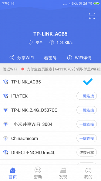 2.超级密码检查功能,自动识别周围所有可用的WiFi。