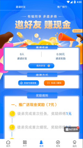 每天定期发布任务,用户能够找到适合自己的任务去完成,每一个任务都会对应着不同的奖励,还会有智能推荐功能,覆盖面是很广的让用户自由选择,一键即可领取任务同时查询到自己当前的收益情况,还能够邀请好友获得额外奖励。