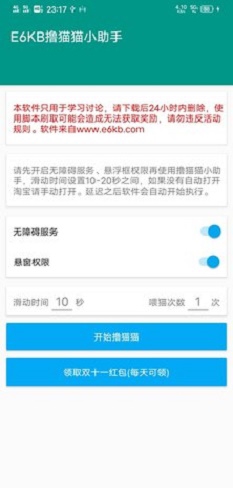 E6KB撸猫助手是一款能够为用户自动领取喵币的app,让我们在双十一的活动中获得更多的优惠折扣,使用方式是非常简单方便的,一键即可启动同时能够在后台稳定运行,帮助用户获得更多的奖励,购物的时候便可以享受超低的价格,喜欢购物的小伙伴可以加入其中。