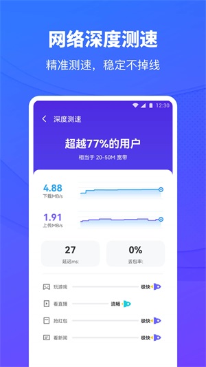 3.深度测速功能,一键式的加速你的网络,让你拥有最佳的运行体验。