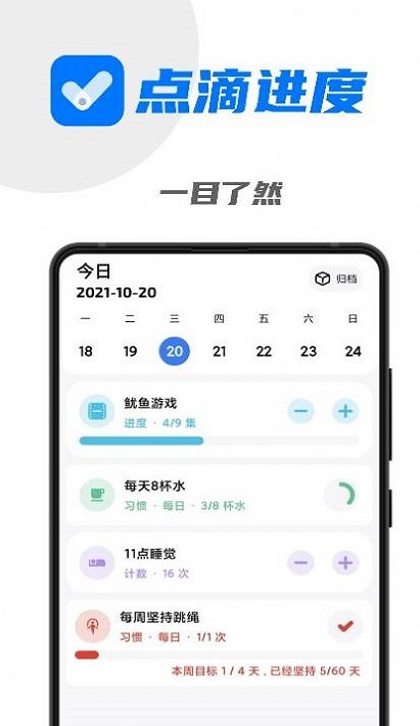 在点滴进度这款APP之中可以进行打卡操作,记录下自己每天需要完成的事情,并且能够设定重点标记,提供了提醒功能,让用户逐渐养成良好的生活习惯,不用再担心会遗忘重要的事情,更具有进度条,可以非常清晰的看到每一件事情的完成情况。