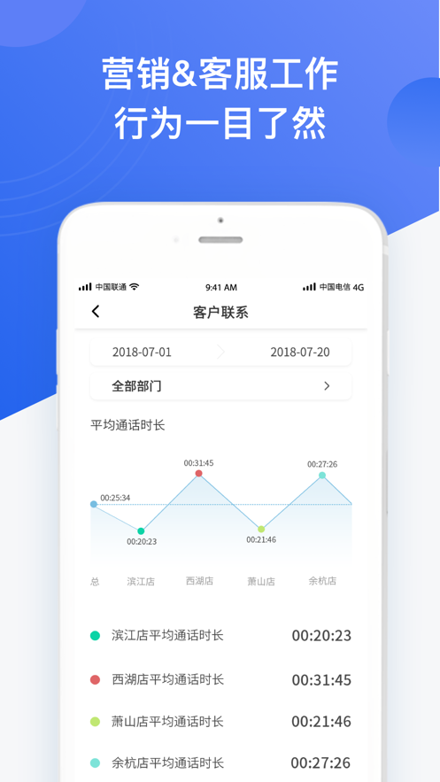 沃工作是一个专门为企业员工打造的管理服务软件。用户可以随时查看营销或者是客服工作的各种行为,每一个通话时长都非常清晰地展示在我们面前,可以进行有效的监管,要不断地和我们的客户进行关系的维护,才会创造更多的价值。