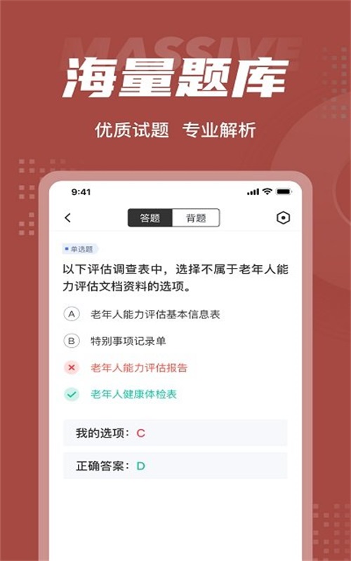 老年人能力评估师考试聚题库是一款非常人性化的app,对考生的帮助很大,通过他,你不仅可以立即掌握各类考生相关信息,同时还可进行答题练习,从而提高你自己的答题速度,帮你抢分。喜欢的就下载体验看看吧