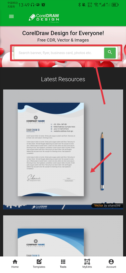 1、打开CDR设计软件手机版后,在home界面中搜索或选择你要下载图片
