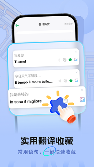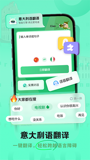 意大利语翻译助手是一个可以轻松翻译意大利语来跨越语言障碍的安卓手机软件,主打精准互译与即时沟通体验。通过语音、文本等多种翻译方式,覆盖旅游出行、购物交流、商务沟通与语言学习等需求,让意语使用过程更加顺畅自然。