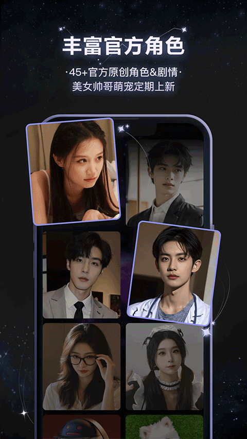 3、多达45+官方原创角色持续更新,例如温柔学长和傲娇总裁,不同人设丰富互动选择。