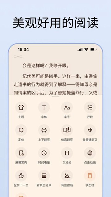 2.阅读页支持常用的字体大小、行距、背景、翻页方式等个性化设置,长时间看也更舒服。