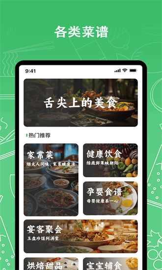 3.热门菜谱推荐的功能,为不同需求的用户推荐适合的菜谱,家常菜,健康饮食,孕婴食谱,宴客聚会、烘焙甜品、宝宝辅食等应有尽有。