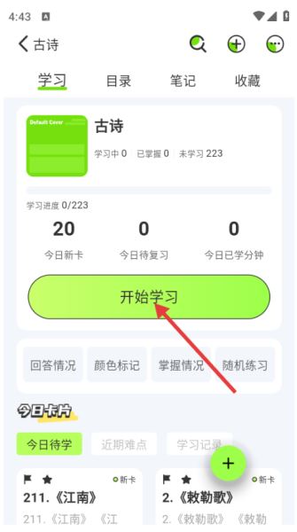 3、在古诗学习页面,点击【开始学习】按钮,进入古诗卡片学习页面。