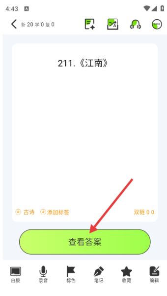 4、在古诗卡片学习页面,可查看古诗题目进行记忆训练,点击【查看答案】按钮,可查看该古诗的具体内容。