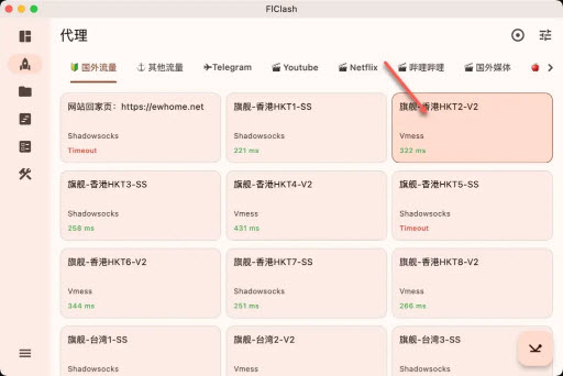 2、在其中找到机场提供的所有海外服务器节点,选择对应节点,如下图;
