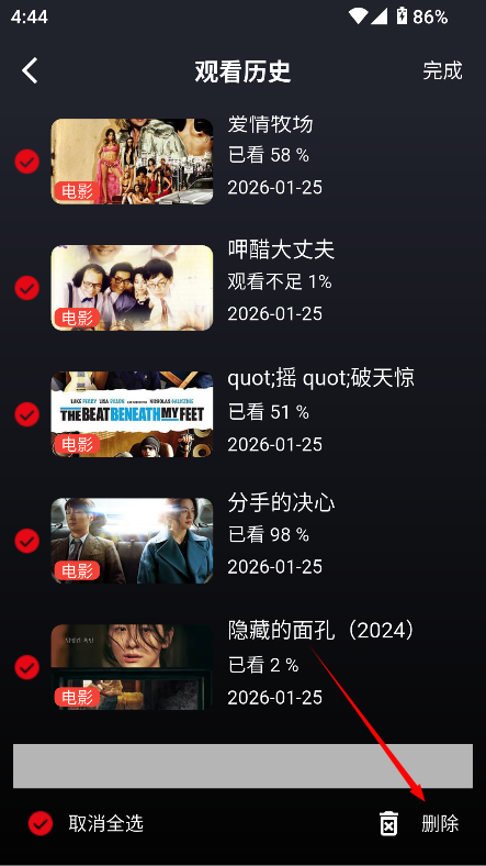 3.如果想删除播放记录,进入“我的”页面,点击“观看历史”,右上角选择“编辑”,然后勾选要删除的记录点击下方“删除”即可。