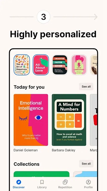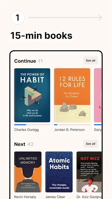 1.提供了1500+的书籍内容摘要,让用户在最短的时间内了解任何非小说类的书籍的主要思想,无论是想读还是想听,都可以在这里找到主题鲜明的内容介绍。