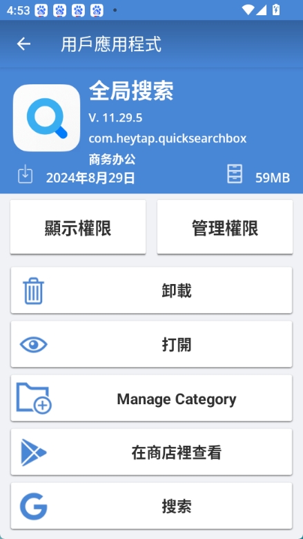 3. 附加实用工具:内置快速启动器,可直接启动应用;提供日夜主题切换、多语言支持、动画开关等个性化设置,并能查看应用权限、分享应用详情。