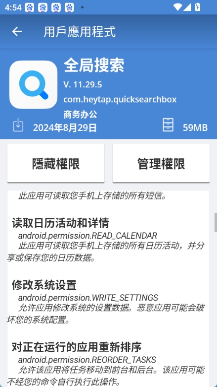 2. 全面的应用管理:列出所有已安装及系统应用,显示名称、版本、大小等详细信息,并提供按名称搜索、按多种条件排序的功能,方便查找与管理。