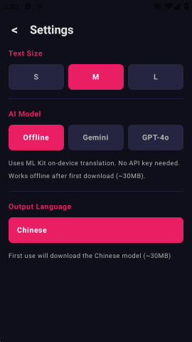 内置ML Kit离线翻译引擎,无需API密钥和网络连接,首次下载语言包后即可随时使用,确保游戏过程不受干扰。
