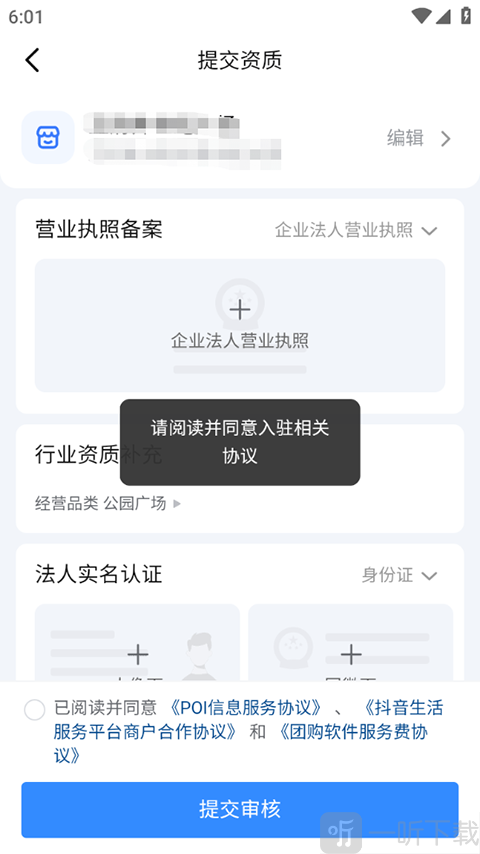 4、最后上传营业执照备案、法人实名认证材料,点击【提交审核】即可。