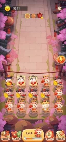 这款游戏采用了非常经典的合成玩法,将相同的小牛合并在一起就可以生成更强大的小牛并且获得更多收益,游戏的玩法十分轻松惬意,并且画面也是非常卡通精美的,利用获得的金币解锁更多不同造型的小牛。