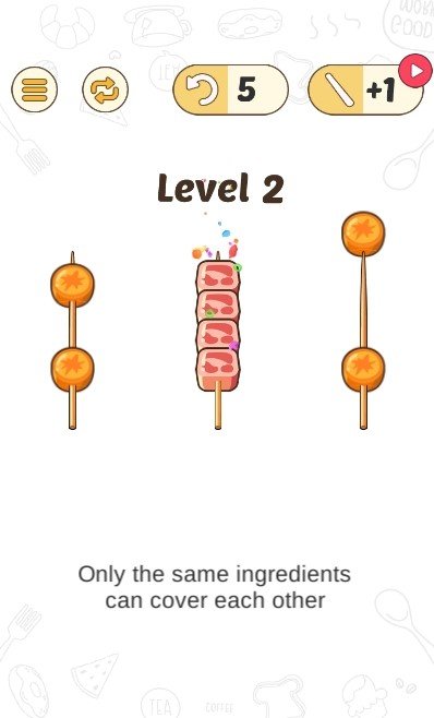 将相同的食材串在一起并且进行拼拼串串这款游戏,画风十分的精美,更具有非常多样的食材,玩家需要合理的运用游戏中出现的竹签完成挑战,每一关都是很考验玩家头脑灵活性的,伴随着轻快的背景音乐享受游戏所带来的乐趣体验。