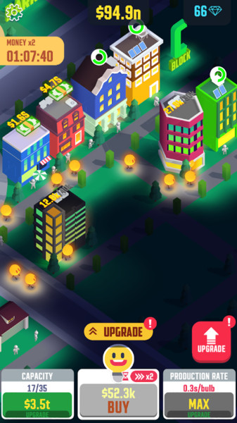 1.通过单击,照亮新地图,解锁建筑物可以轻松获得灯泡,从而可以赚取更多金币。