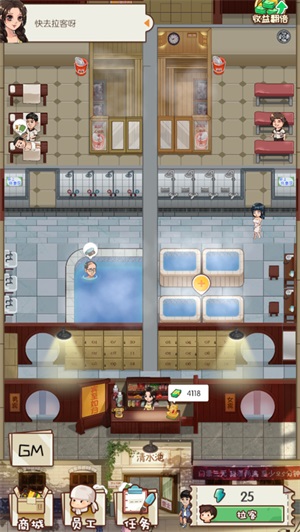 这是一款非常有意思的模拟小游戏,画面设计非常的真实,虽然卡用了卡通风格,但是让每个玩家也有身临其境的游戏体验,在这里不断的升级自己的装备,让自己的澡堂变得更加的独特,更加的有优势。