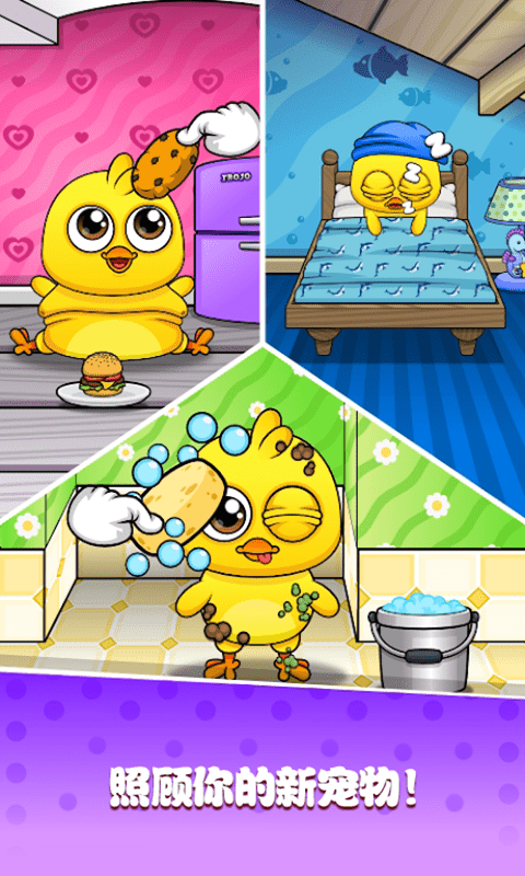 1.通过喂食、洗澡、玩耍、哄睡等方式照顾宠物小鸡;