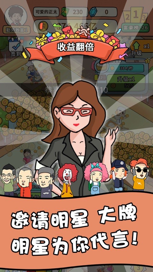 这款游戏玩起来非常的上头,玩家可以在这里体验搞笑的游戏环节,摆摊的商品多种多样,如何能吸引更多的顾客是你需要思考的事情,不断的升级,可以更快速的赚取到金币,完成一定的成就可以提升你的排名榜,想要成为百万富翁的玩家快来体验吧。