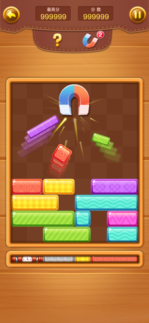 1、移动方块,让方块在空隙掉落,当方块填充成一条线时,它将被消除并获得积分,持续消除还可以额外获得分数