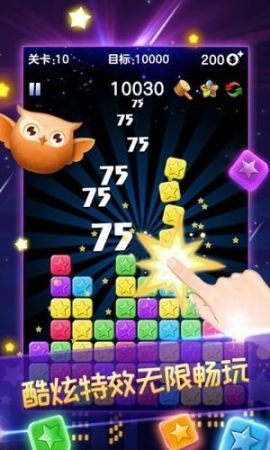 相同的星星被放置在一起之后可以产生消除效果,消除的元素越多越好,带来的分数会更高,能够给自己无聊的时光增添很多的趣味体验,还具有炫酷精美的画面效果使玩家的视觉感受变得更好,合理运用道具能够加快通关的速度。