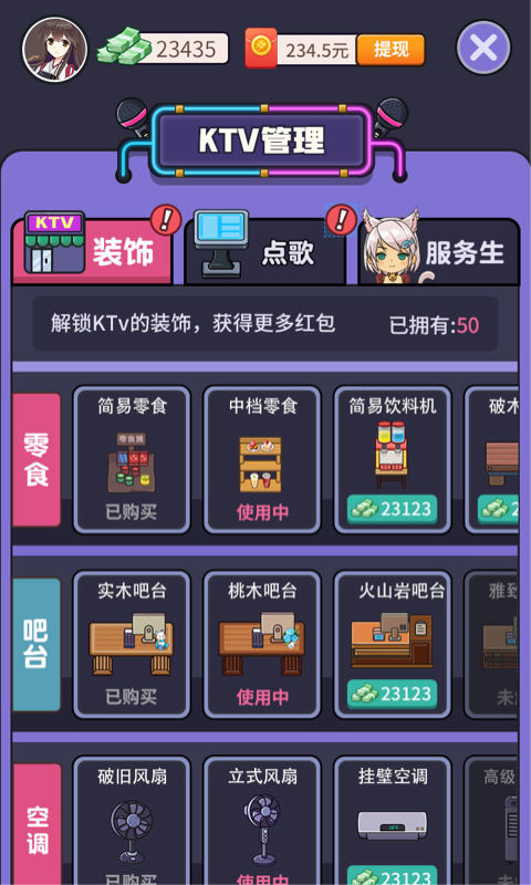 3.解锁各种装饰品并且将KTV变得越来越好,吸引更多顾客来到这里。