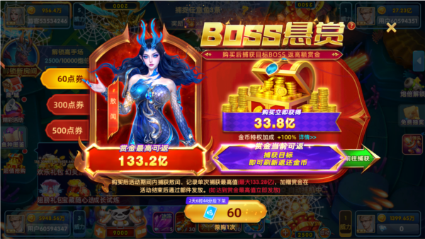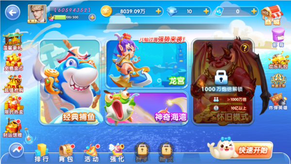 玩法升级多样:赛季玩法全新上线,超级场开放,远古巨鲨和史诗BOSS轮番出现,爆率更高,金币收获更轻松。