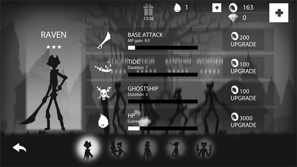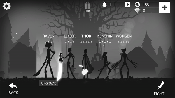 1. 进入游戏后会出现五位不同的火柴人,除了第一位初始火柴人之外,剩余的需要利用金币和砖石来进行解锁