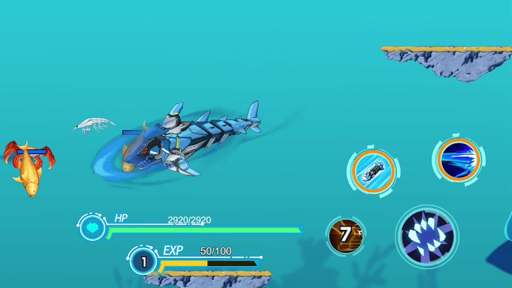 2.收集宝藏和道具,提升机械鲨鱼等级和能力。