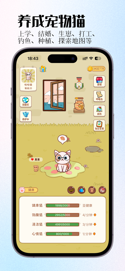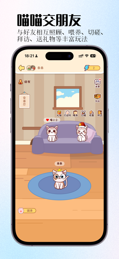 1. 猫咪养成:喂食、训练和任务完成都能提升猫咪等级,解锁更多技能和装饰道具。