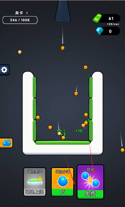 3.通过免广告的模式,可以获得更多的小球和垫子,需要玩家不断的去增加小球的数量,然后点击合成,完成关卡任务。