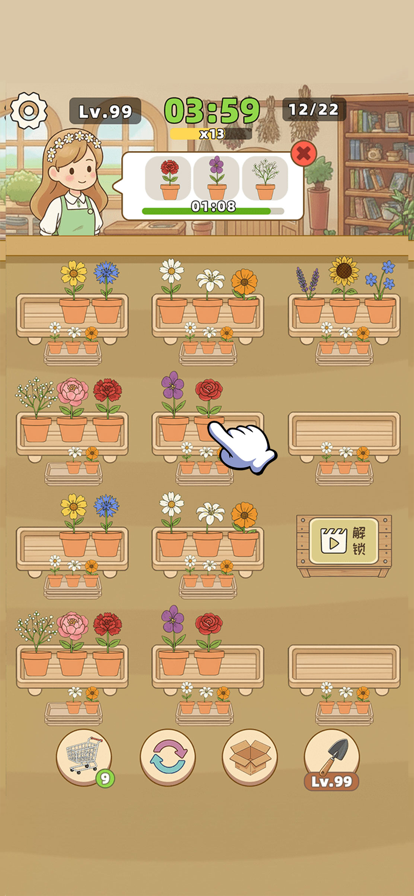 2、玩家需要提升自己对花朵的整理速度,这样才能够将所有的花朵全部整理好。
