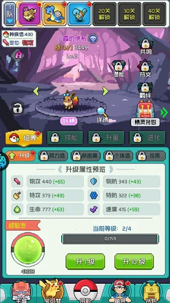 3. 游戏的核心乐趣在于精灵的长期培养。玩家需要对获得的精灵进行升级、进化(包括Mega进化和极巨化)以及技能强化,不断提升其战力,以应对后续更具挑战性的冒险。