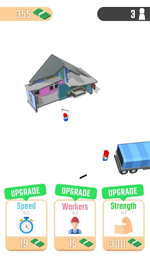 玩家在小小拆迁队这款游戏中可以完成一系列的拆除任务,每一个关卡中都会出现不同的建筑物,合理的搭配工人并且让他们开始工作,将建筑物一点一滴的拆除,游戏的画风非常简约,同时具有非常独特的玩法,可以让玩家感受到许多的乐趣。