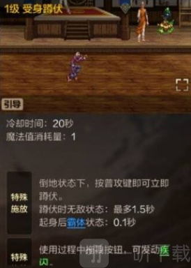 受身蹲伏在被对手击倒后可以使用,倒地状态下按住该技能不放可以在短暂时间里处于下蹲无敌状态,躲避对手的后续技能,配合使用疾闪能够快速拉开安全距离。